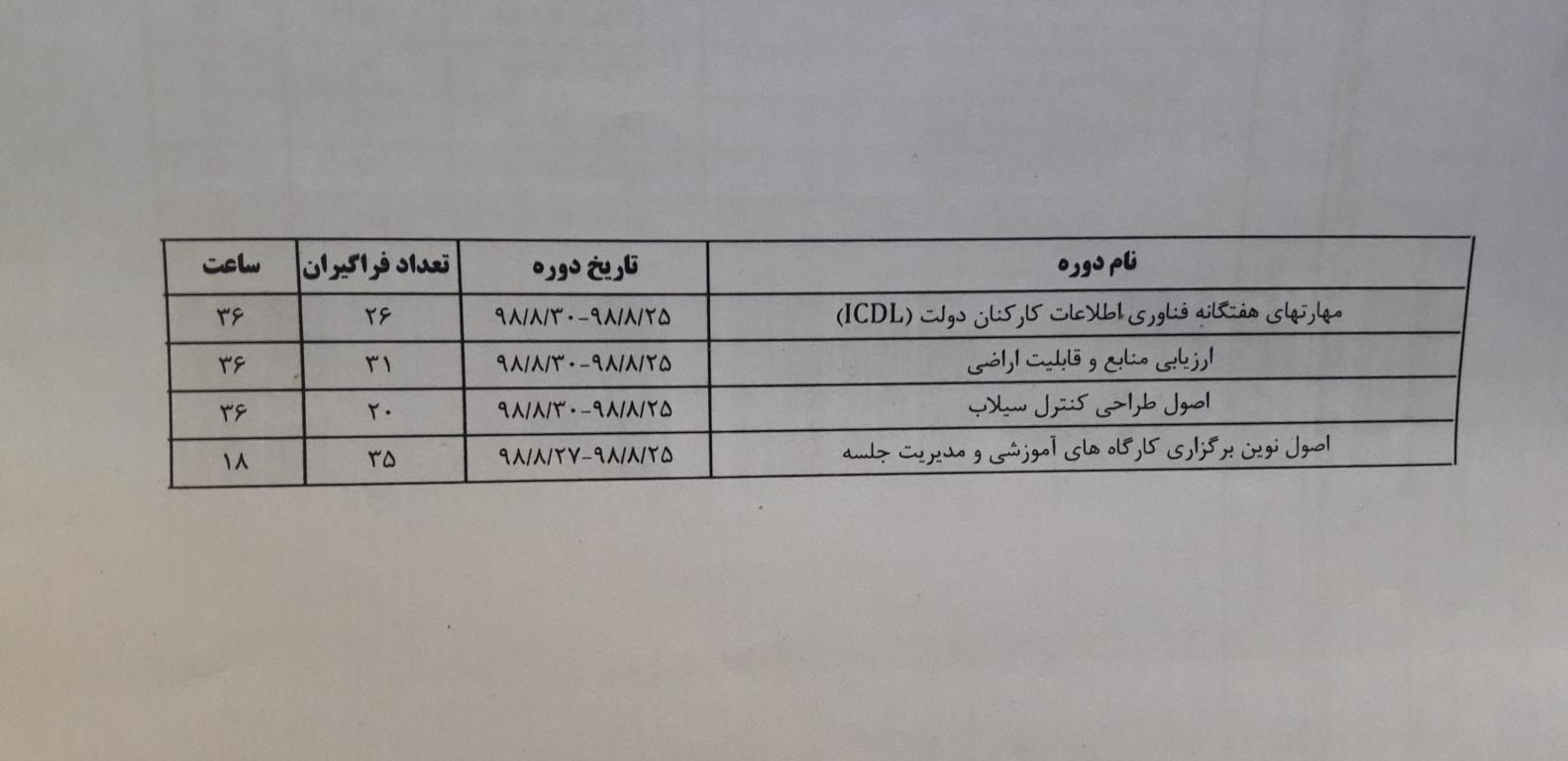 فراخوان دوره های آموزشی ضمن خدمت ، مورخ 98/8/25 لغایت 98/8/30 که دراین مرکز برگزار میگردد .