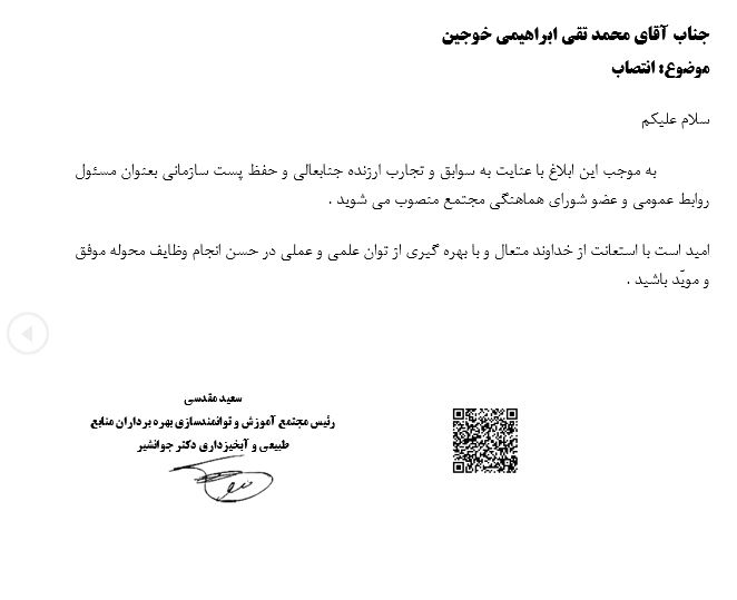 انتصاب آقای ابراهیمی به عنوان مسئول روابط عمومی و عضو شورای هماهنگی