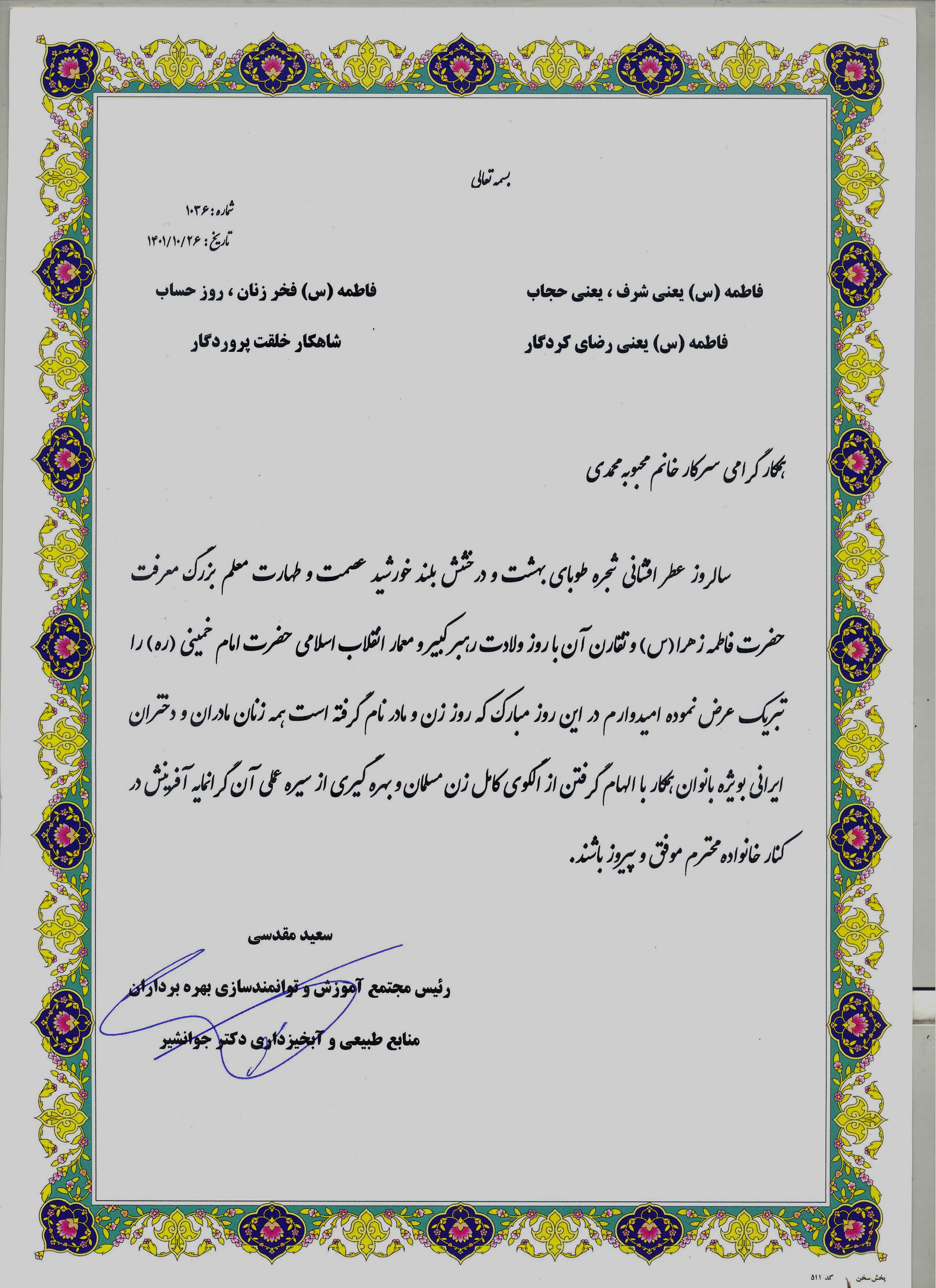 مراسم روز مادر و زن در روز دوشنبه مورخ 1401/10/26 در سالن جلسات مجتمع آموزشی دکتر جوانشیر به میزبانی آقای دکتر سعید مقدسی، رئیس مجتمع آموزشی دکتر جوانشیر و با حضور بانوان همکارمجتمع برگزار گردید. بعد از تلاوت آیاتی چند از قرآن کریم، ریاست محترم مجتمع با تبریک روز ولادت حضرت فاطمه، روز مادر و زن، و نیز ولادت امام خمینی، نخست یادآوری کردند که با وجود برنامهریزی برای برگزاری مراسم در روز جهارشنبه یا شنبه، تأخیر در برگزاری این مراسم به خاطر بروز مشکلات و تعطیلات پیشبینی نشده بر اثر برودت هوا بوده است. سپس در ادامه سخنانشان به مقام والای مادر و نیز حضرت فاطمه به عنوان الگو پرداختند و در این خصوص شعری از علامه اقبال لاهوری را ذیل عنوان رموز بیخودی »در معنی اینکه سیدة النساء فاطمة الزهراء اسوه کاملهایست برای نساء اسلام» خواندند. همچنین علی شریعتی نیز در اثر خود با عنوان «فاطمه، فاطمه است» همین مضمون علامه را در خصوص نسبتهای پرافتخار حضرت فاطمه تبیین میکند.